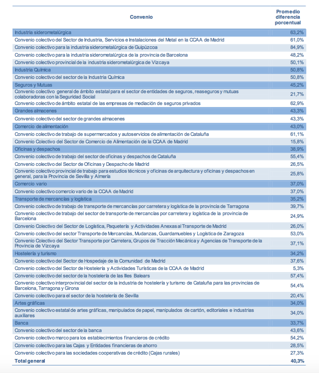 En promedio, el encarecimiento derivado de igualar las condiciones salariales de unos y otros trabajadores sería del 40%. En la hostelería, el repunte rondaría el 34%, mientras que en los grandes almacenes se produciría un crecimiento del 43%. El aumento más fuerte se daría en la siderometalúrgia, con un 63% más de costes salariales.