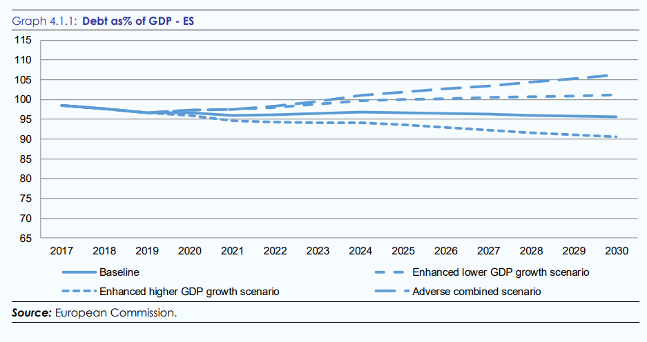 La propia Comisión Europea ya nos ha enviado un aviso serio sobre la cuantificación del riesgo político de un gobierno compuesto por quienes están más cerca de la irresponsabilidad argentina que de la rigidez presupuestaria alemana: Si nuestro ejecutivo indexa las pensiones al IPC está en juego una factura de unos 50.000 millones de euros en una perspectiva de 2050. 4,7 puntos porcentuales de PIB a añadir a una factura de la Seguridad Social que ya de por sí es abultada, y que todos coinciden en que crecerá como consecuencia de la desaceleración en el mercado laboral. Por el momento, el gasto por desempleo ya se ha incrementado en 2019 por primera vez desde 2014 y la tasa de paro todos coinciden que tiene poco recorrido a la baja.