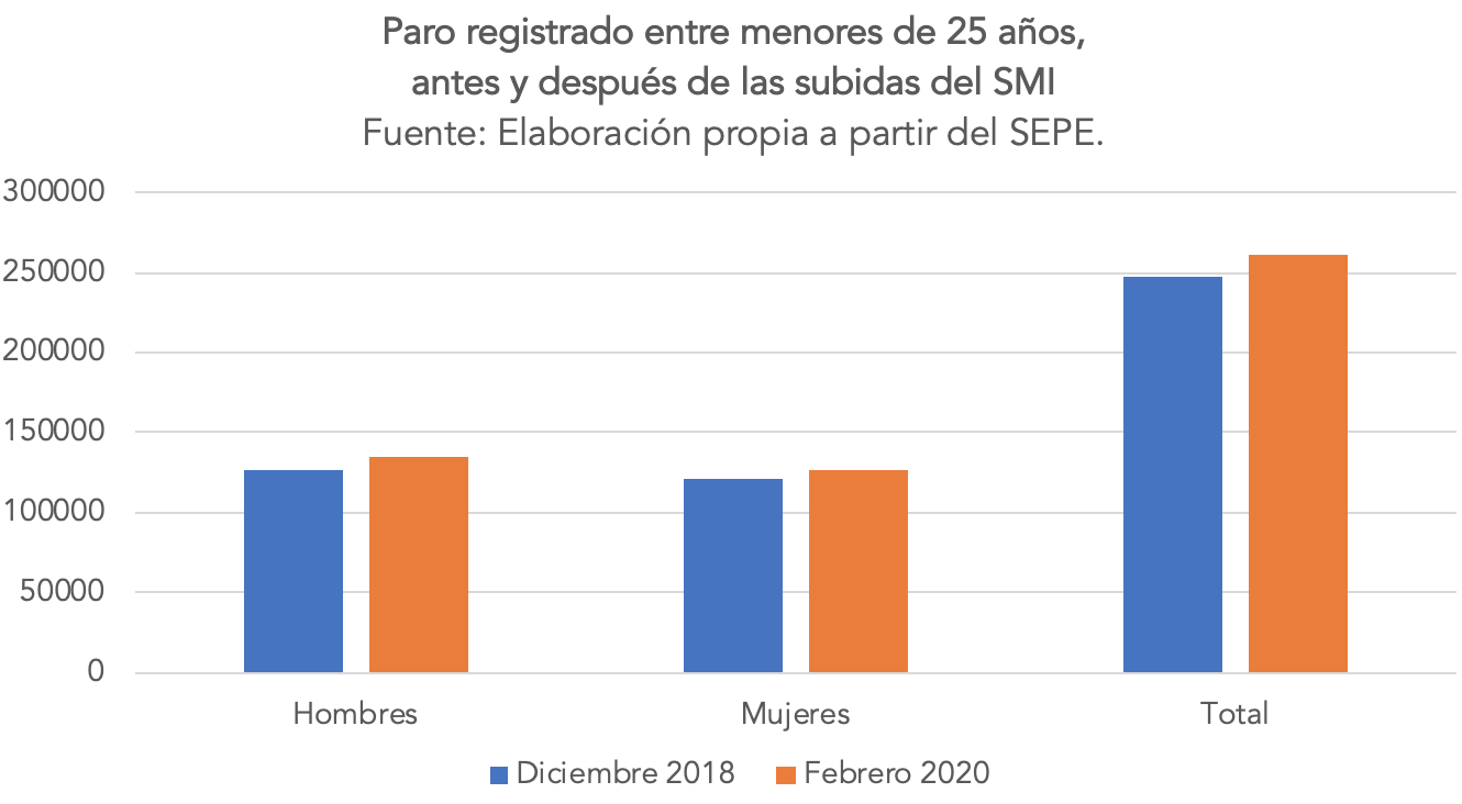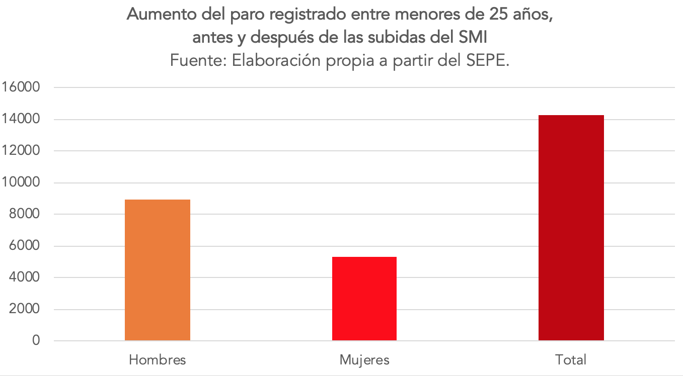 Comparativamente, esto significa que el paro de los hombres menores de 25 años ha experimentado una subida de 8.919 efectivos durante los catorce meses de aplicación de las subidas del salario mínimo. Por otro lado, las mujeres menores de 25 años han visto cómo su paro registrado aumenta en 5.317 efectivos durante ese mismo periodo. En suma, el aumento en la incidencia del paro de este colectivo es de 14.236 personas.