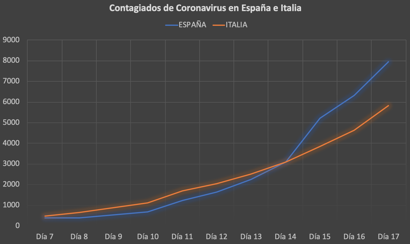 Si hacemos esta corrección, podemos ver que España se movía en niveles inferiores a Italia. El "día 7", por ejemplo, teníamos 401 contagiados, frente a los 470 de Italia. Sin embargo, si avanzamos al "día 17", encontramos que España se movió ayer en torno a los 8.000 afectados (hoy son más), mientras que el país transalpino se quedó por encima de los 5.800 entre los días 7-8 de marzo (su día 17). Esto significa que, haciendo el ajuste pertinente, España tiene hoy un 36% más de contagiados de los que Italia contaba cuando la pandemia llevaba diecisiete días propagándose de forma creciente.