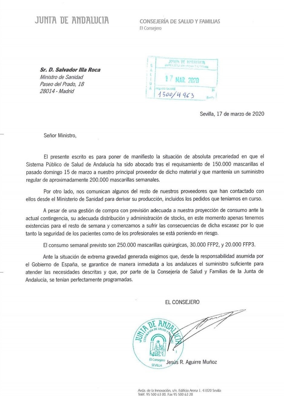 ¿Consecuencia? La Junta de Andalucía se ha quedado sin su pedido, con la consiguiente desprotección de sus sanitarios. La respuesta no se hizo esperar, ya que la Consejería de Sanidad andaluza remitió una carta al ministro de Sanidad denunciando la situación, dado que el requisamiento les había dejado sin su principal proveedor de mascarillas en un momento crítico. Y algo parecido sucede con el resto de sus suministradores, dado que el Gobierno les ordenó derivar toda su producción al Ministerio.
