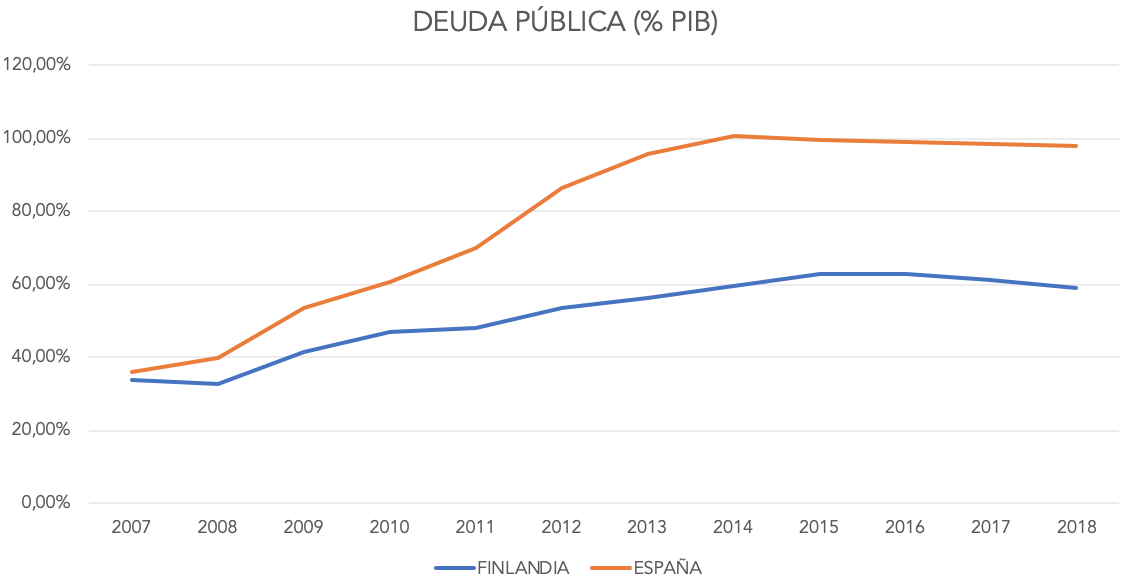 En cuanto a la deuda pública, dicho indicador se ha estabilizado en torno al 60% del PIB desde el año 2014, mientras que en España se ha "enquistado" alrededor del 100% del PIB, casi 30 puntos por encima que el país nórdico.