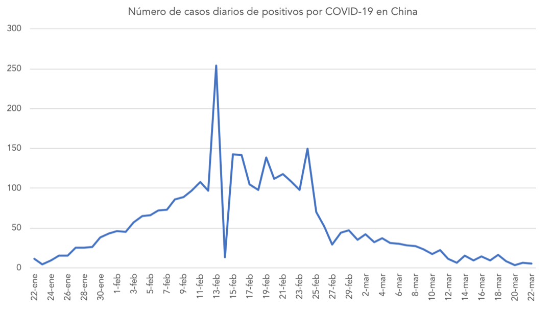 Si damos por buenos los datos oficiales que ha compartido China, encontramos que el número de casos diarios de positivos por COVID-19 se estabilizó en torno al 15-25 de febrero y pasó a reducirse de forma sostenida en las semanas siguientes. El siguiente gráfico recoge la evolución de la curva de nuevos contagiados comunicados por las autoridades del régimen.