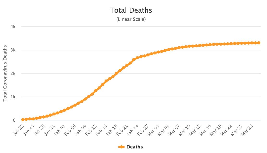 De igual modo, la curva de fallecidos correspondiente a las estadísticas oficiales muestra una escalada progresiva del número de muertos hasta superar la barrera de los 3.000 a comienzos de marzo. El 85% de tales fallecimientos (unos 2.500) se corresponderían con la provincia de Wuhan. Desde entonces, estas cifras se habrían mantenido más o menos estables, tal y como muestra el siguiente gráfico.