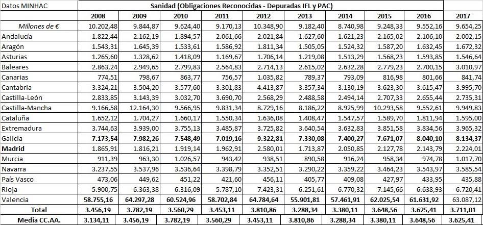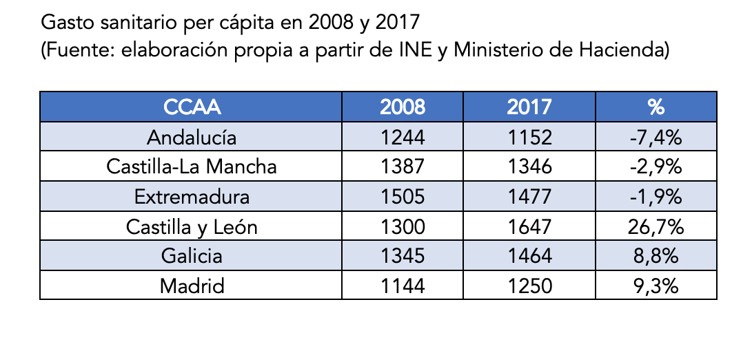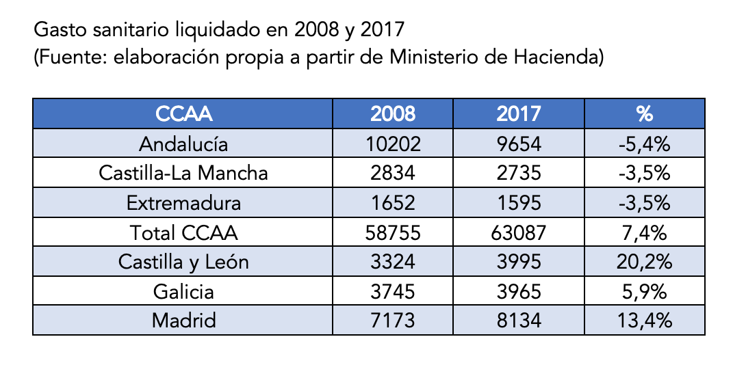 Si sumamos el gasto sanitario de Andalucía, Castilla-La Mancha y Extremadura vemos que en 2008 ascendía a 14.688 millones de euros, mientras que en 2017 se había reducido a 13.984 millones, lo que supone una caída de 704 millones. Haciendo el mismo ejercicio para Castilla y León, Galicia y Madrid, las cifras apuntan a una subida desde los 14.242 hasta los 16.094 millones de euros, un aumento de 1.852 millones .