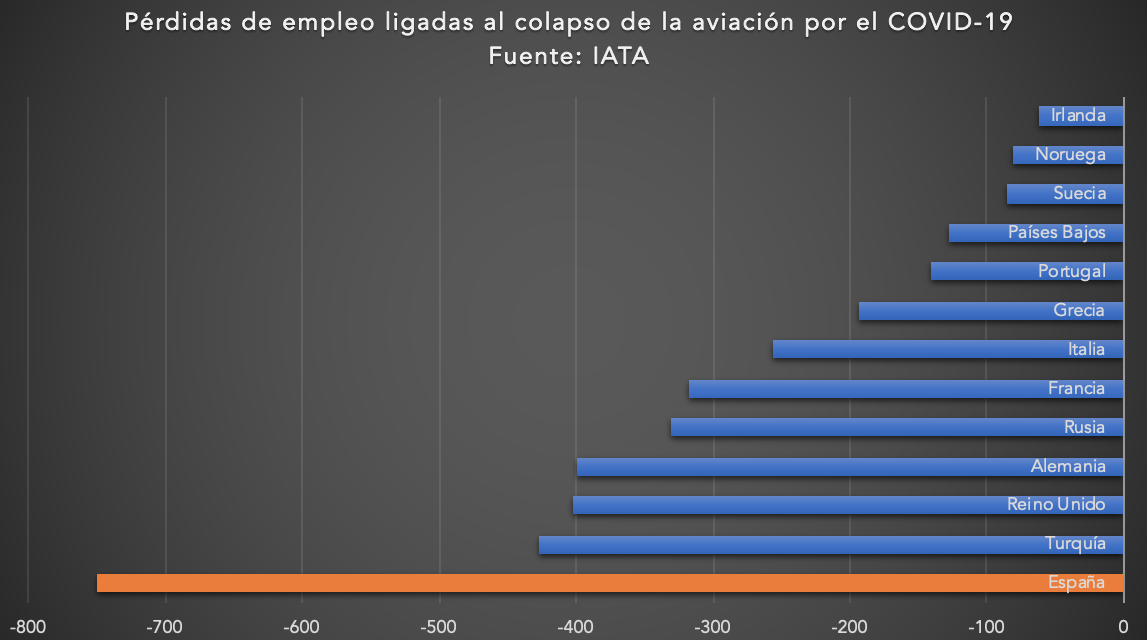Pero la crisis del coronavirus está golpeando duramente a la aviación, de modo que toda esa riqueza está en peligro si no se toman medidas rápidamente. En España, las pérdidas potenciales de empleo ligadas al colapso de la aviación que ha provocado pandemia rondan los 750.000 puestos de trabajo, según estimaciones de IATA. Se trata de la cifra más abultada de todos los mercados analizados por la oficina europea de la patronal de las aerolíneas.