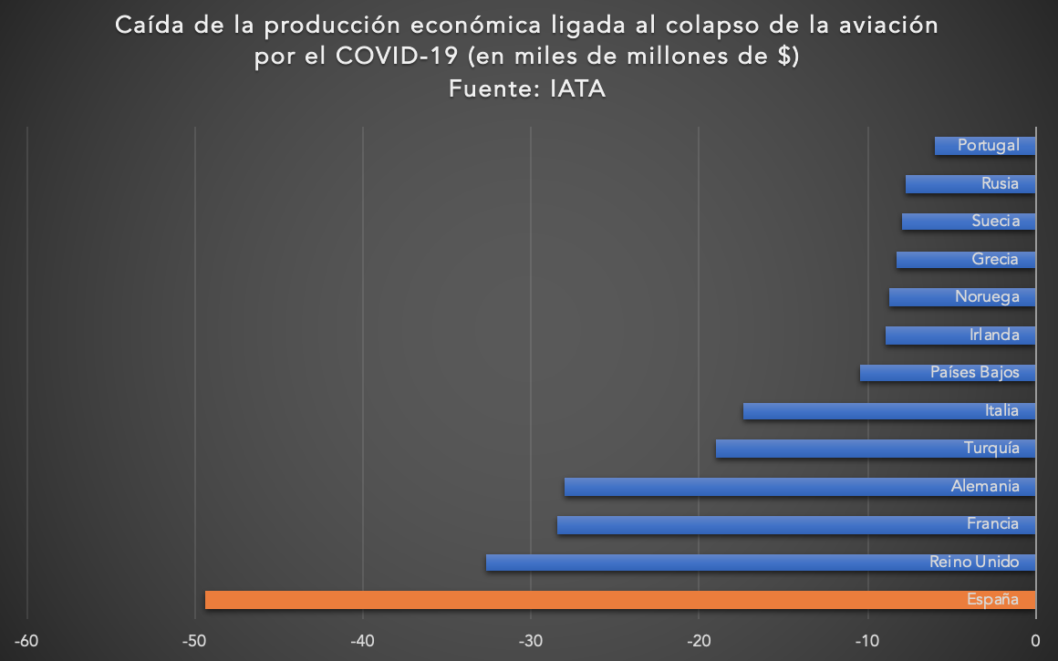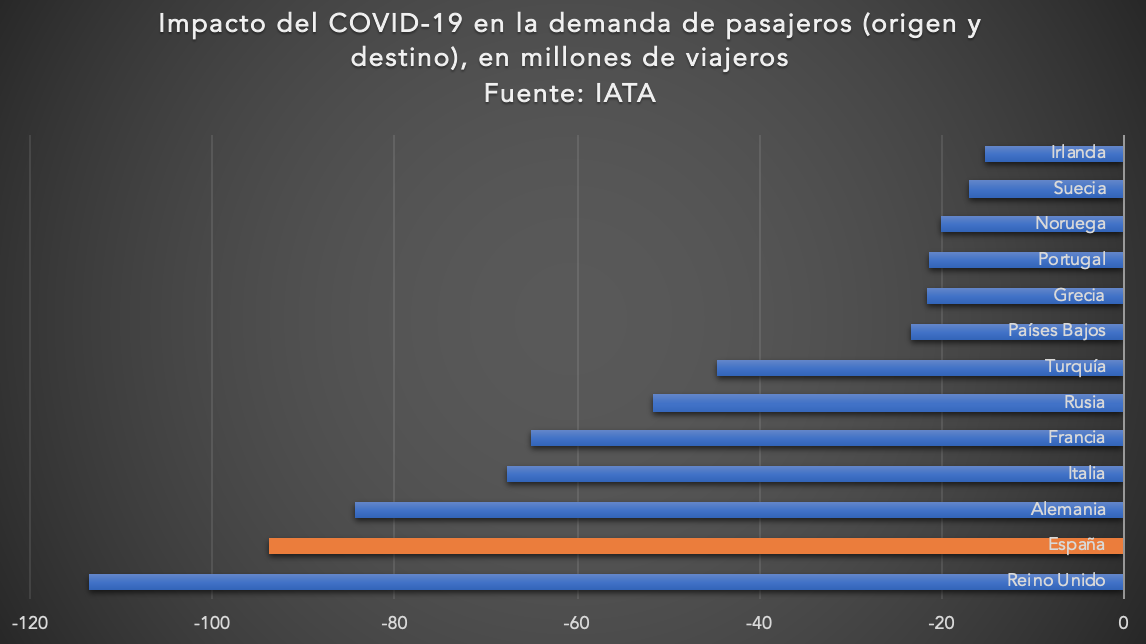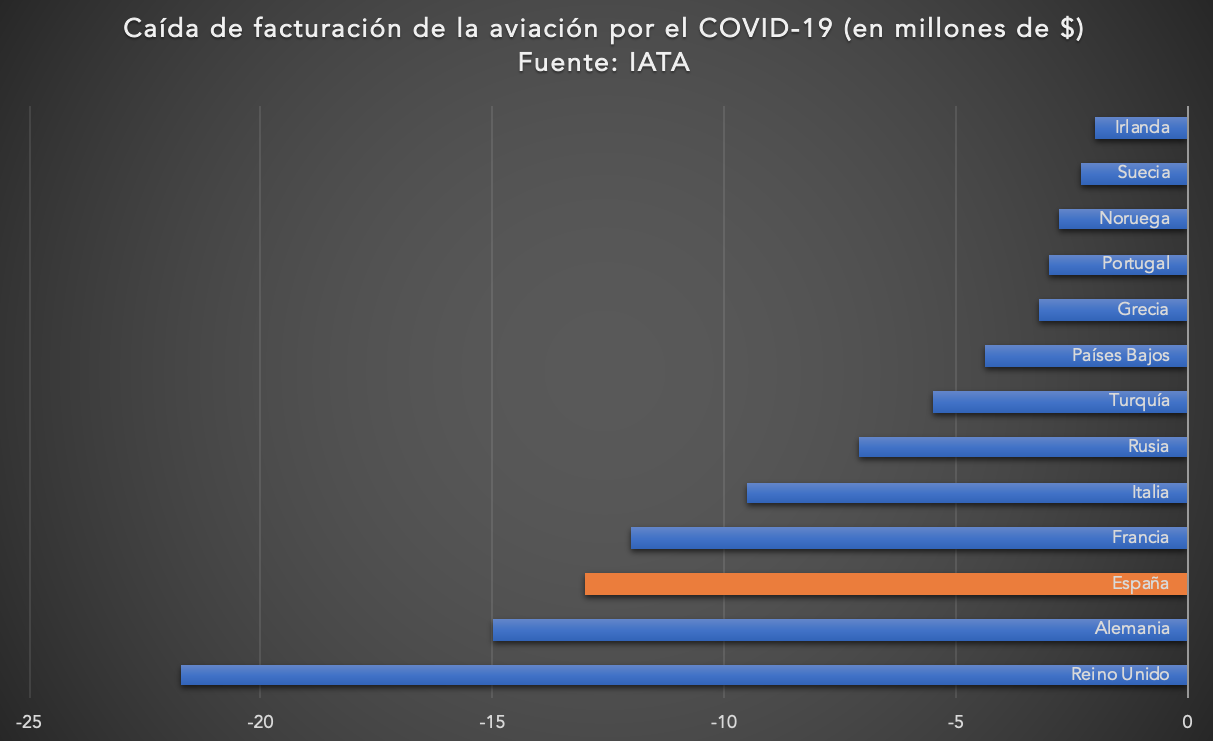 El sector ve con mucha preocupación la pérdida de facturación que puede generar la pandemia, puesto que hablamos de una rama de actividad márgenes reducidos y costes operativos elevados. Para España, la reducción sería de 13.000 millones de dólares. Solo las compañías de Alemania y Reino Unido enfrentan ahora mismo cifras más abultadas, con 21.700 y 15.000 millones de facturación perdida, respectivamente.
