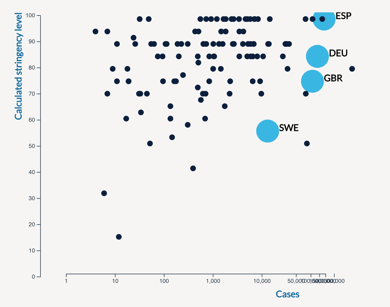 Desde que estalló la crisis sanitaria del coronavirus, Suecia ha apostado por medidas de aislamiento social mucho menos radicales que las aplicadas en otros países. Se han tomado algunas decisiones restrictivas, como la prohibición de reuniones de más de 50 personas, pero no se han dado pasos tan drásticos como los que sí vemos en España y otros países. Así, en el índice de restricciones que ha elaborado la Universidad de Oxford, Suecia recibe alrededor de 55 puntos, casi la mitad de la nota para España o Italia.