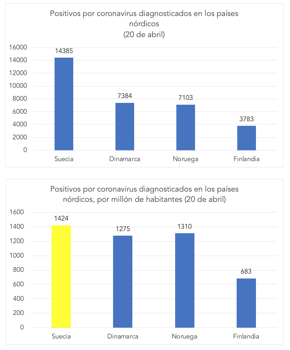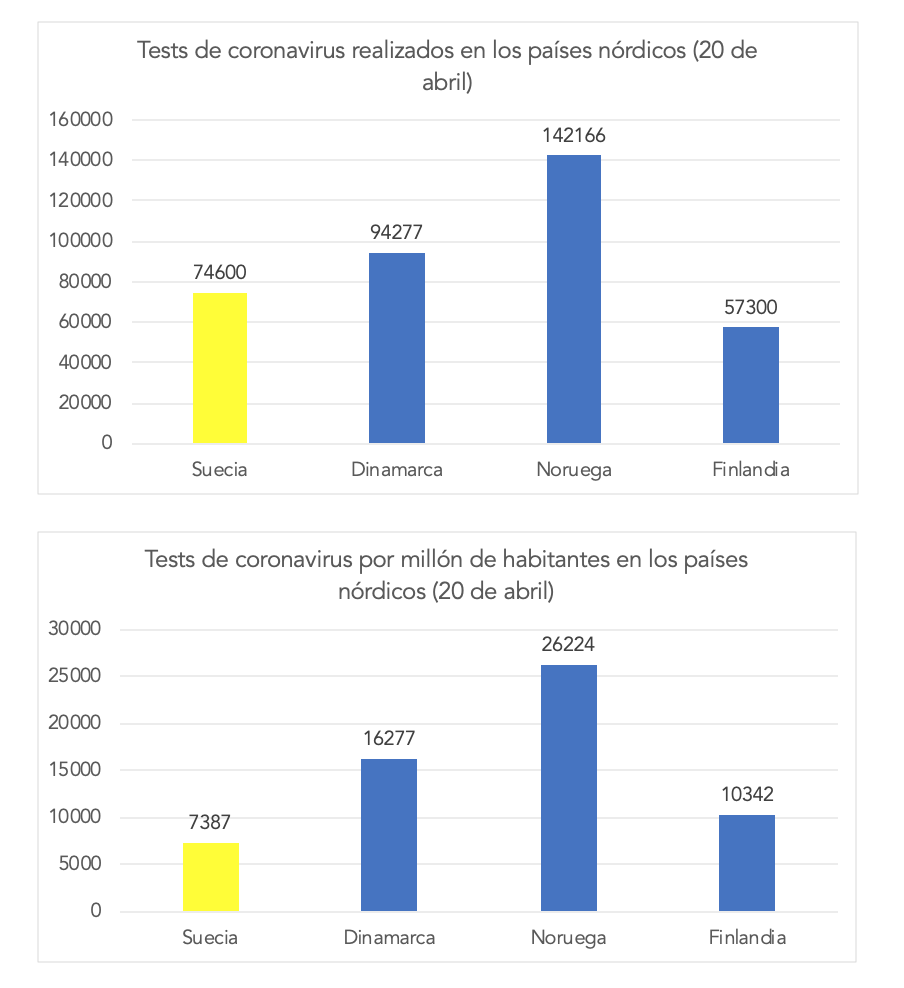 Sin embargo, en la medición referida al número de test realizados, Suecia sí presenta datos alejados a los de sus vecinos, tanto en los datos brutos como en la tasa por habitante.