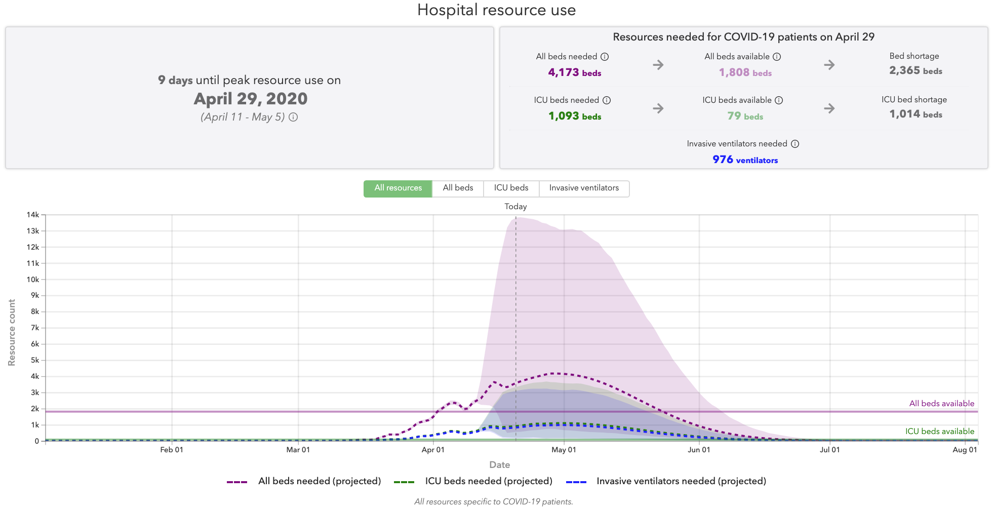 En cuanto a la saturación y congestión del sistema sanitario, los indicadores que maneja el IHME anticipan que el pico en materia de presión sobre los hospitales se alcanzará en torno al 29 de abril, una cifra que también debería coincidir con el punto de inflexión en materia de mortalidad.