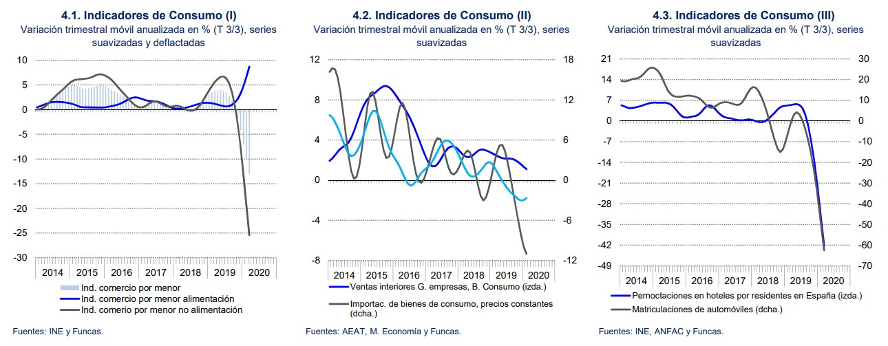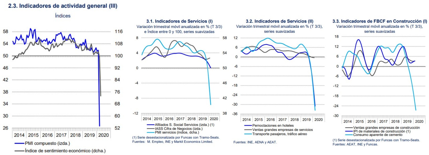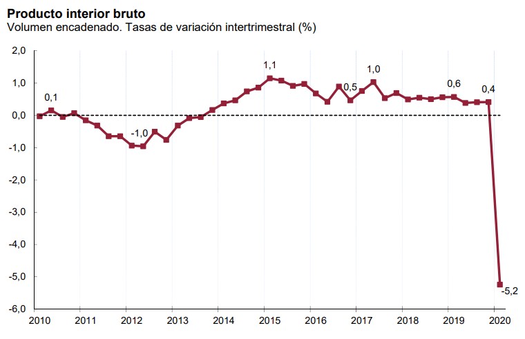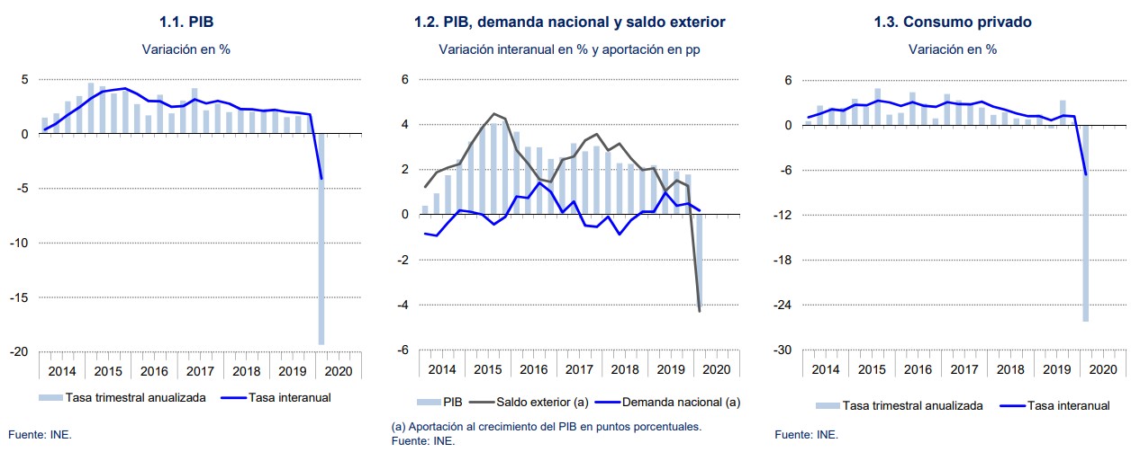 La economía española cayó un 5,2% intertrimestral y un 4,1% interanual, debido, especialmente, al hundimiento del consumo de los hogares (-7,5%) y la inversión, mientras que, por el lado de la oferta, destaca el deterioro de la construcción, cuyo valor añadido bruto se reduce un 8,6%, y de los servicios (-4,1%), con fuerte incidencia en comercio, transporte y hostelería (-9,7%), así como en actividades artísticas y recreativas (-10,7%).