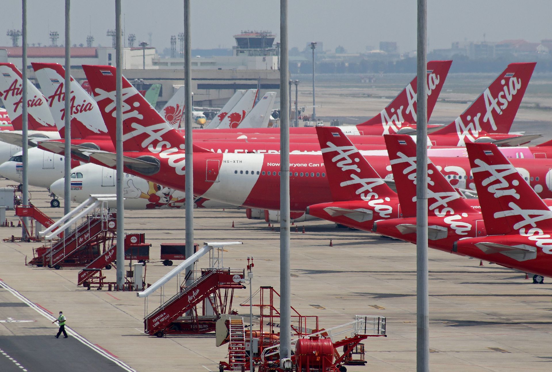 Decenas de aviones de Air Asia aparados en el aeropuerto de Bangkok, Tailandia.