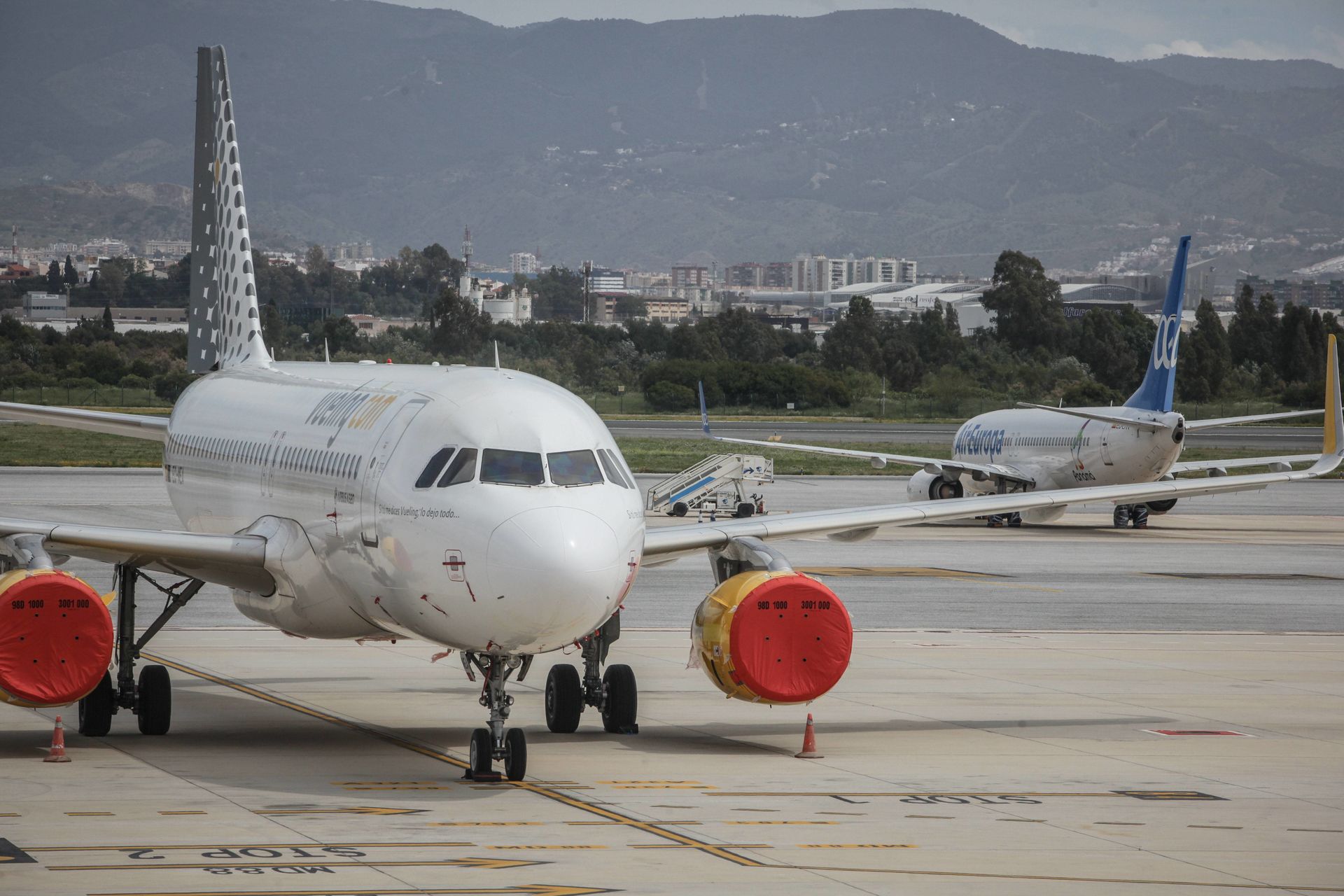 Los motores de un avión permanecen tapados a la espera de poder volver a volar en el aeropuerto de Málaga, España.