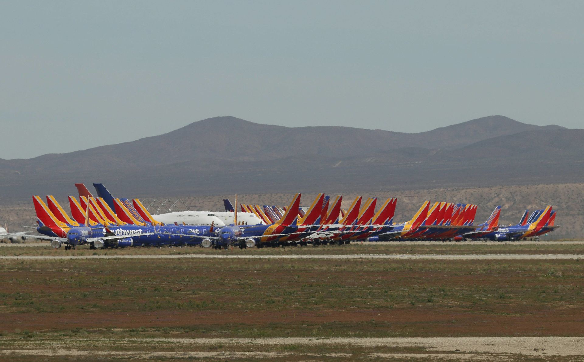 Decenas de aviones permanecen estacionados en el depósito de aeronaves de Victorville, en California, USA.