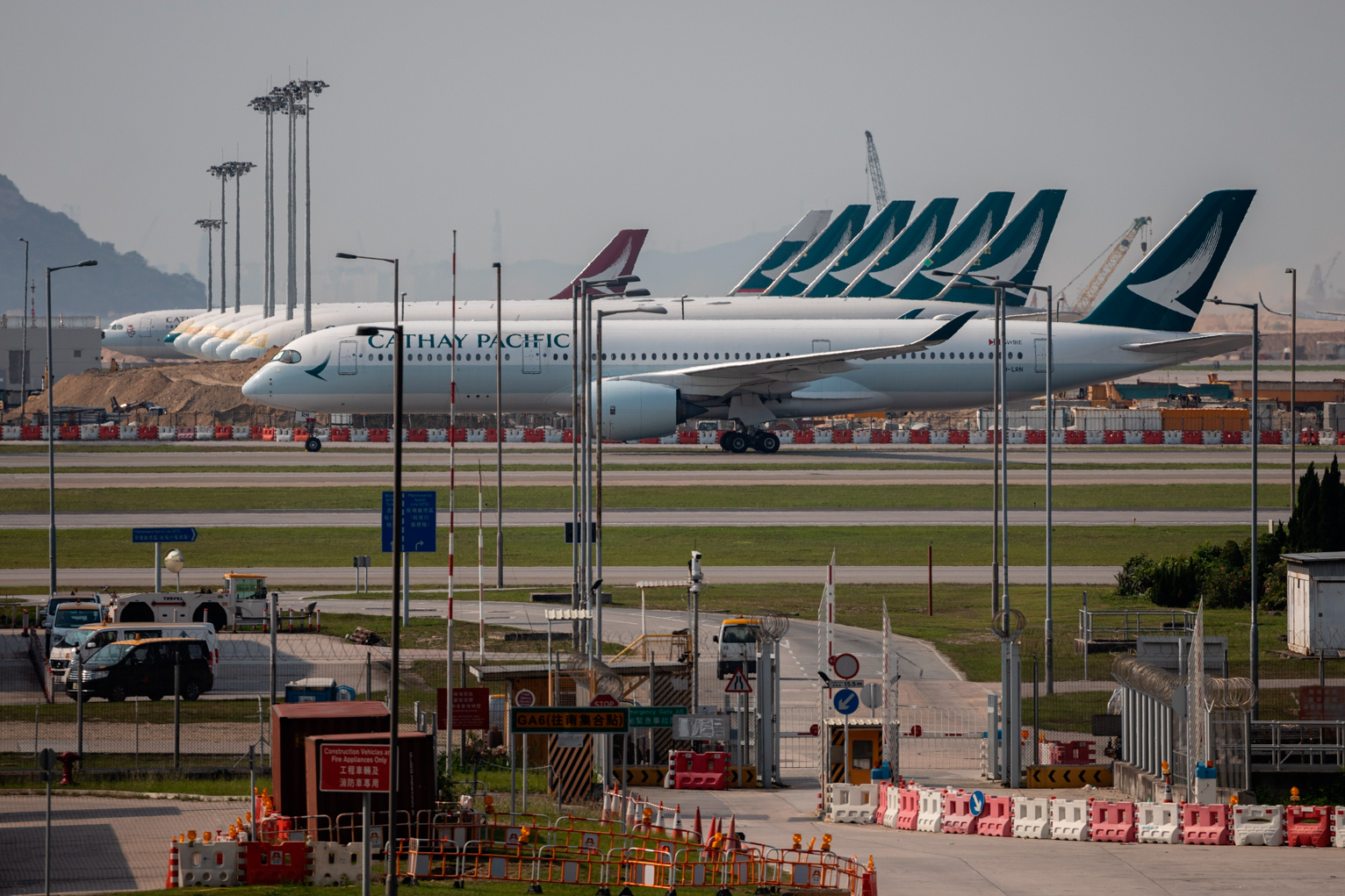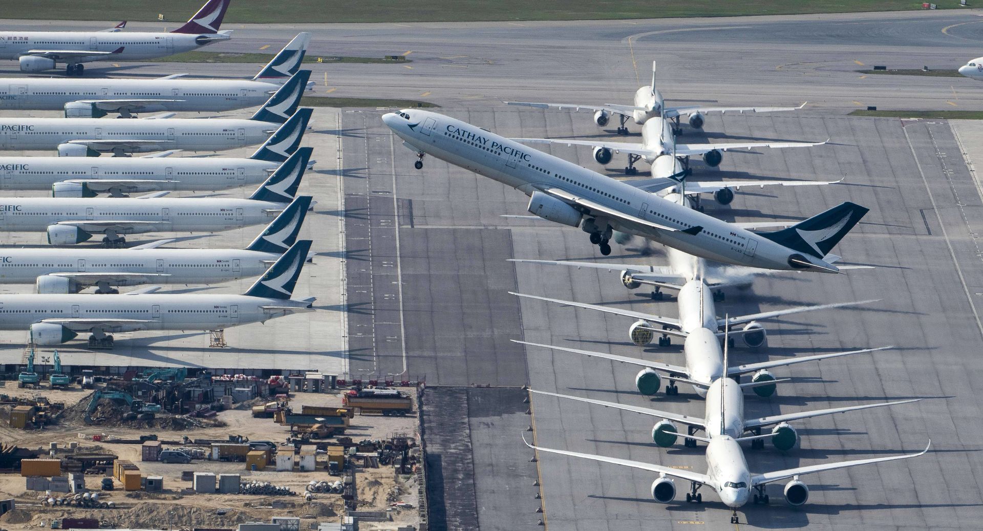 Decenas de aviones de Cathay Pacific permanecen estacionados en el aeropuerto internacional de Hong Kong.