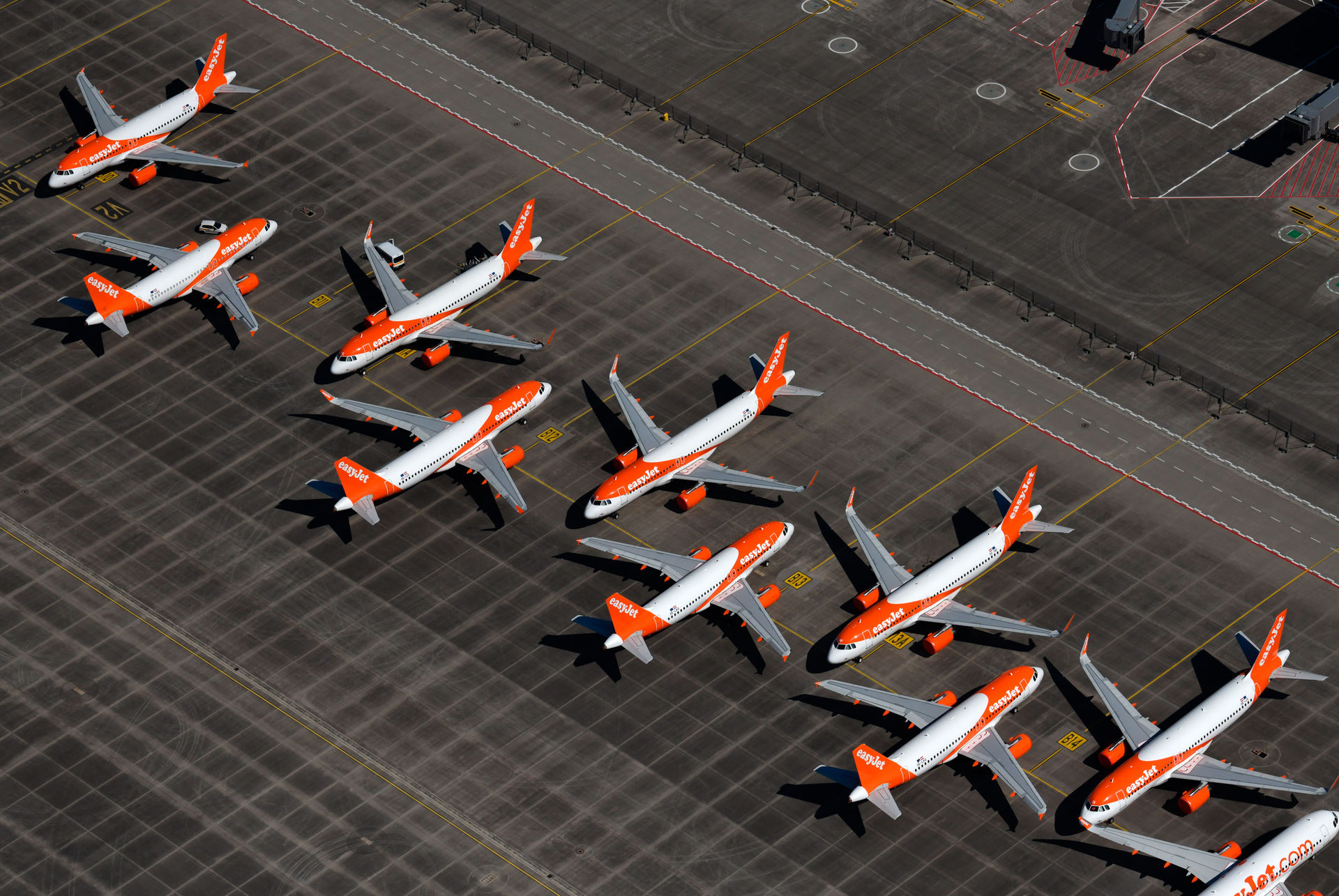 Una vista de la colocación de varias aeronaves de Easy Jet estacionadas en el aeropuerto de Berlín.