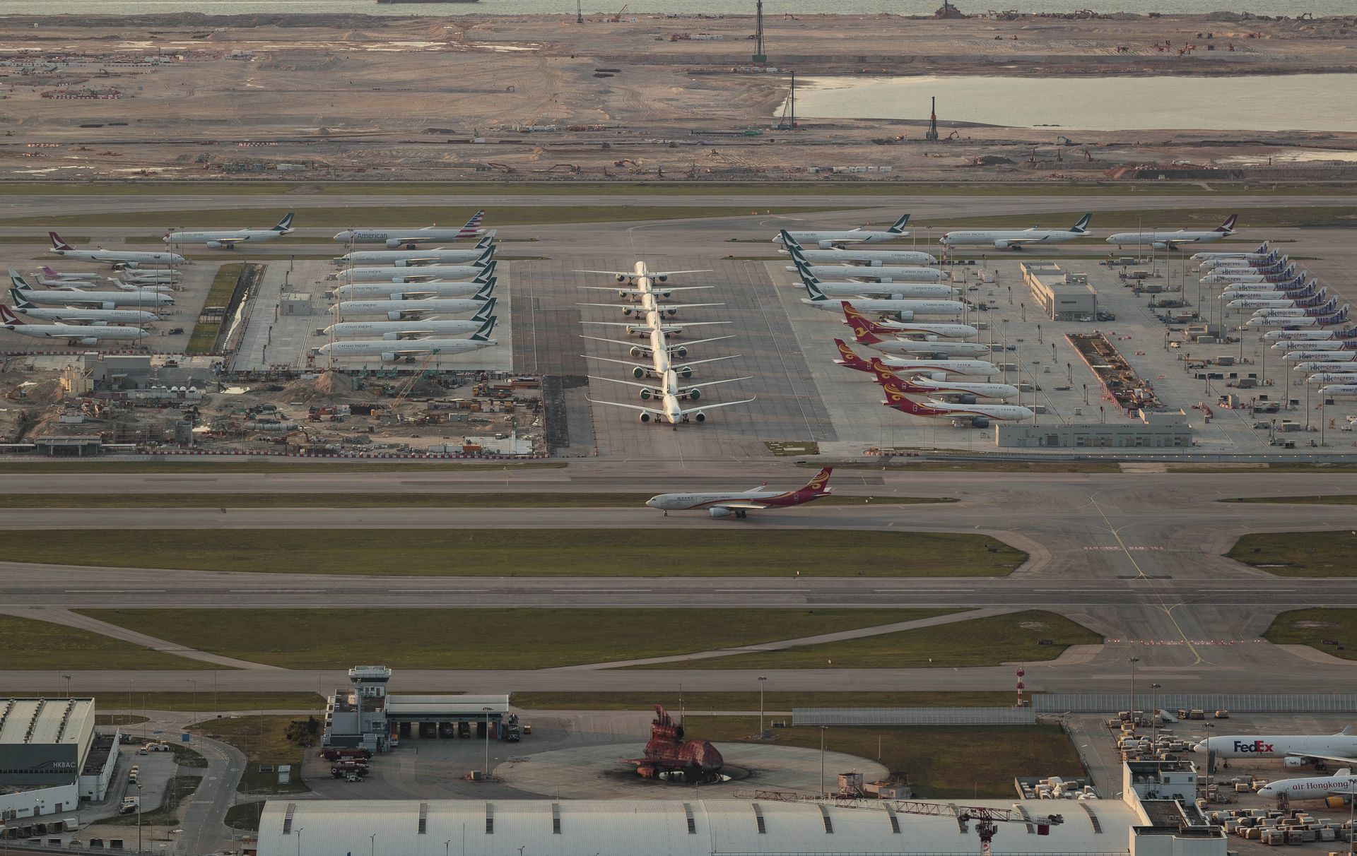 Vista aérea con decenas de aeronaves estacionadas en el aeropuerto de Hong Kong.