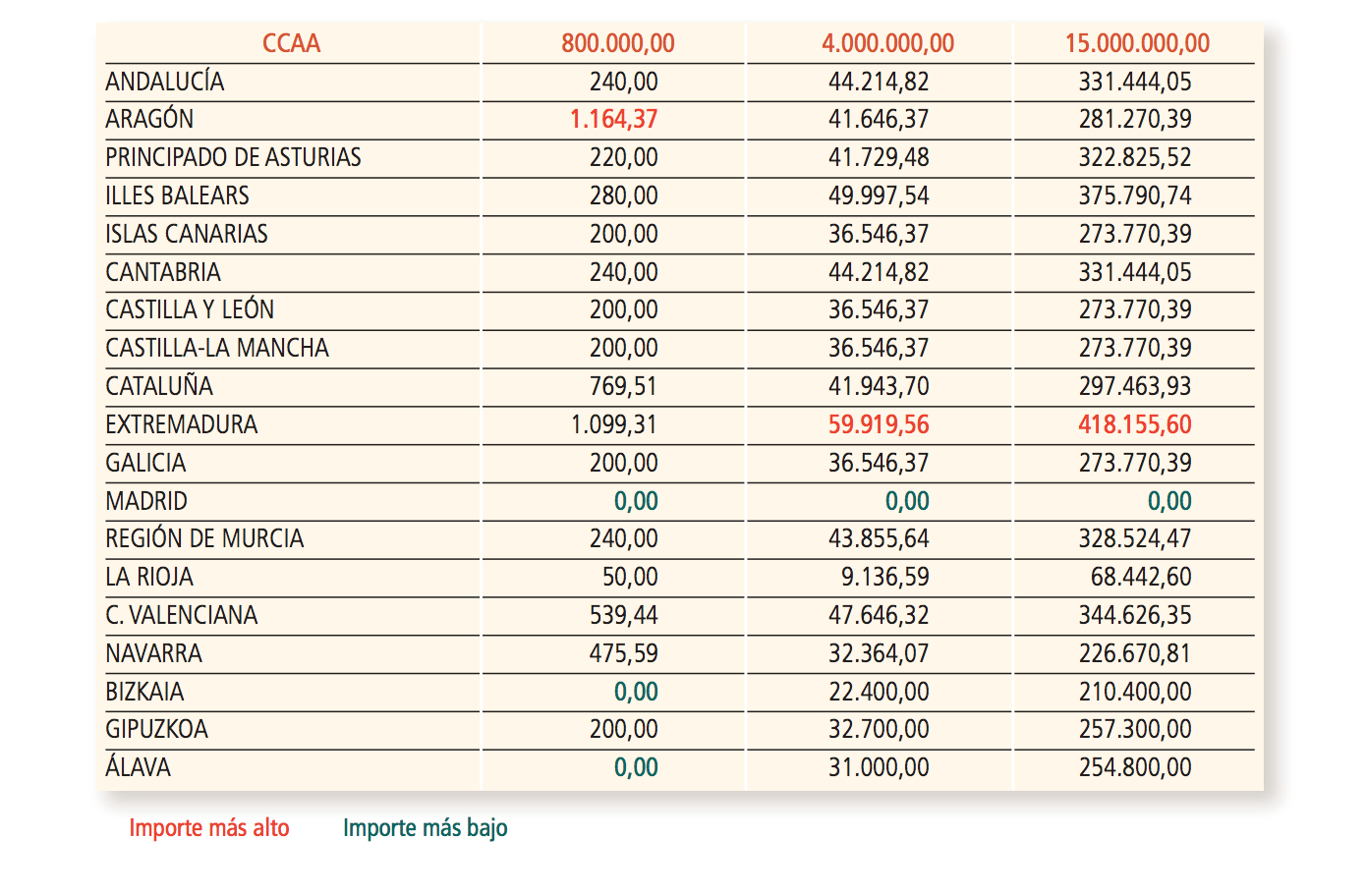 - Hay un mínimo exento de 700.000 euros, aunque algunas CCAA lo tienen por debajo, como Aragón (400.000 euros), Cataluña y Extremadura (500.000 euros) y la Comunidad Valenciana (600.000 euros).