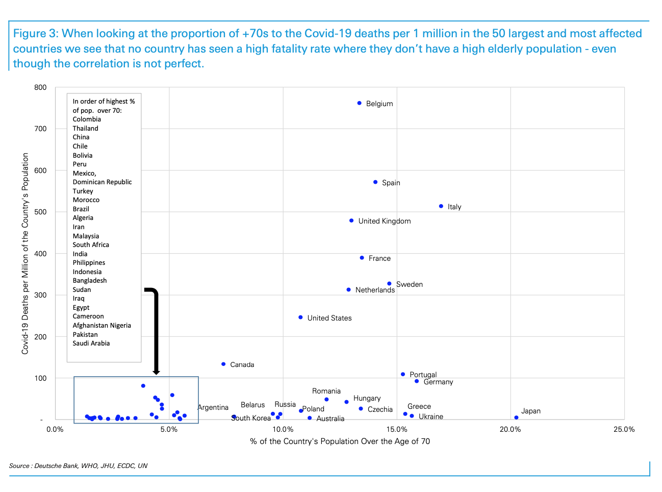 Empecemos por la mortalidad del patógeno entre el grupo de edad de mayor riesgo: el de los mayores de 70 años. Aunque nuestra sociedad sí tiene una estructura demográfica más envejecida que la del resto de países de nuestro entorno, lo cierto es que hay siete países con un mayor porcentaje de ciudadanos por encima de los 70 años de edad, amén de otros ocho que se mueven en niveles parecidos. Sin embargo, los cálculos del servicio de estudios de la entidad teutona dejan a España en segundo lugar de la tabla, solo por detrás de Bélgica.