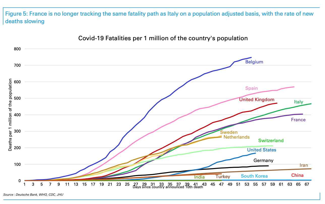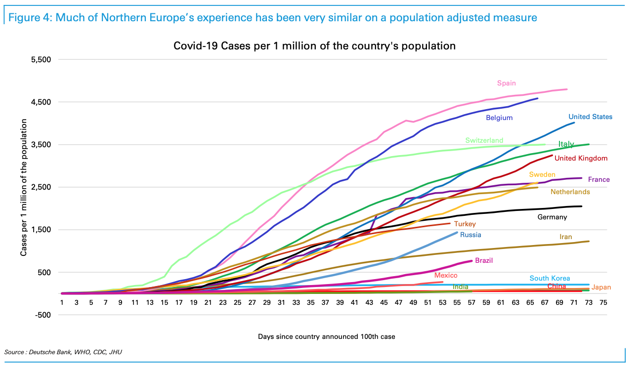 El servicio de estudios de Deutsche Bank ha publicado en las últimas semanas varios informes sobre la incidencia sanitaria y económica del coronavirus. Lejos del triunfalismo exhibido en diversas comparecencias por el presidente del gobierno español, Pedro Sánchez, y el resto de su gabinete, las estadísticas que maneja la entidad germana dejan a nuestro país muy mal parado en ambos frentes: el de la salud y el de la actividad productiva.