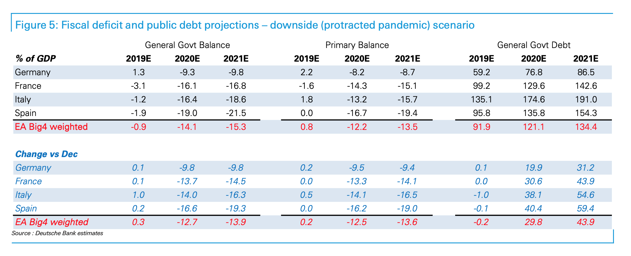 Por último, el servicio de estudios del banco germano ha planteado la posibilidad de que se produzca una crisis fiscal mucho mayor de la anticipada por la mayoría de organismos. Este cálculo de escenario pesimista apunta a un enquistamiento del déficit público durante 2020 y 2021, pero arroja situaciones muy distintas dependiendo del país analizado, puesto que el déficit para Alemania se movería en torno al 9-10% del PIB, mientras que el descuadre presupuestario España oscilaría entre el 19-22% del PIB.