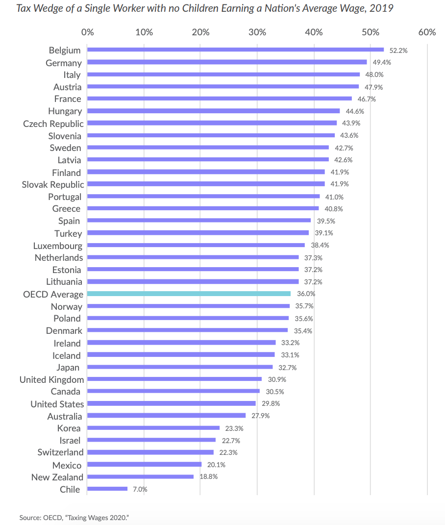 El siguiente gráfico, elaborado por la Tax Foundation con datos del informe Taxing Wages, muestra el ranking al completo: