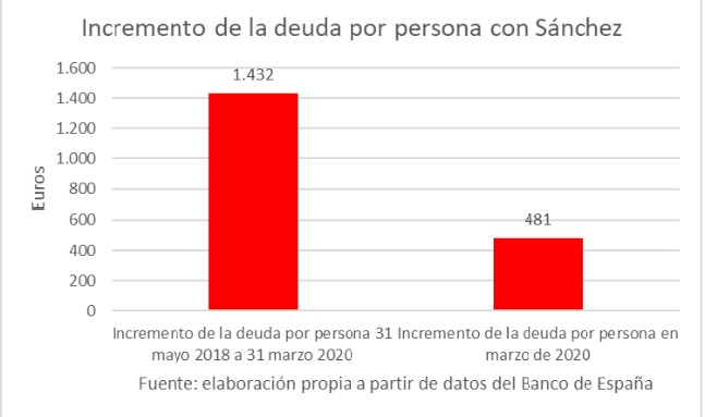 Eso hace que Sánchez esté incrementando la deuda pública con la que asfixia a cada español. Así, desde que gobierna, ha incrementado la deuda por persona en 1.432 euros. Sólo en el último mes lo ha hecho en 481 euros por español.