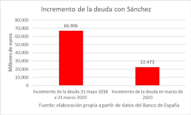 Y ahora Sánchez sigue igual. Se ha publicado los datos a marzo sobre la deuda de las administraciones públicas españolas y ha experimentado un fuerte incremento, ni más ni menos que de 22.473 millones de euros en el mes de marzo, un tercio de todo lo que Sánchez ha incrementado la deuda desde que llegó al Gobierno (66.906 millones de euros).