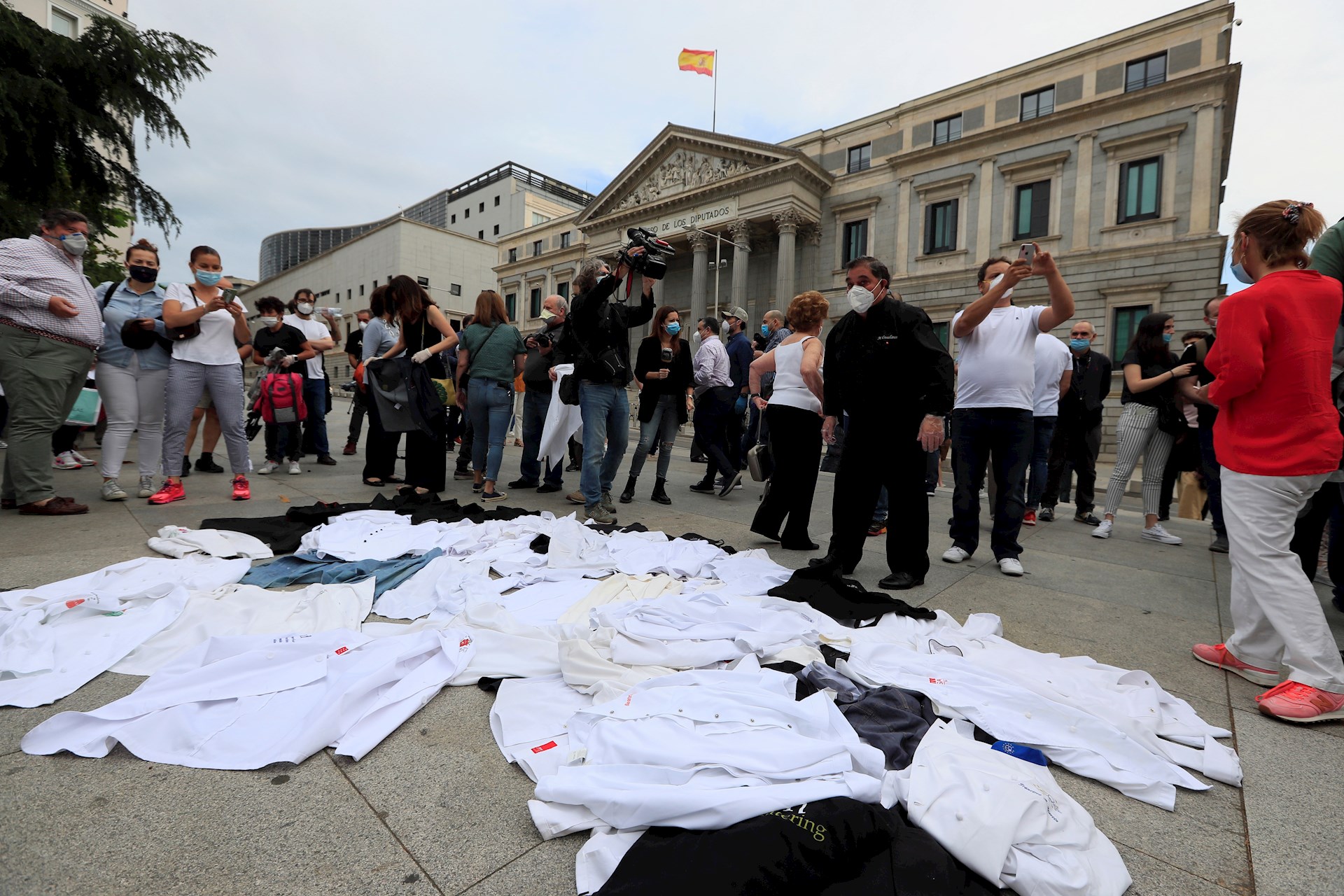 Durante el acto, los chefs, que llevaban puestos guantes, mascarilla y sus chaquetillas de cocinero, han dejado sus chaquetillas dobladas frente al Congreso.