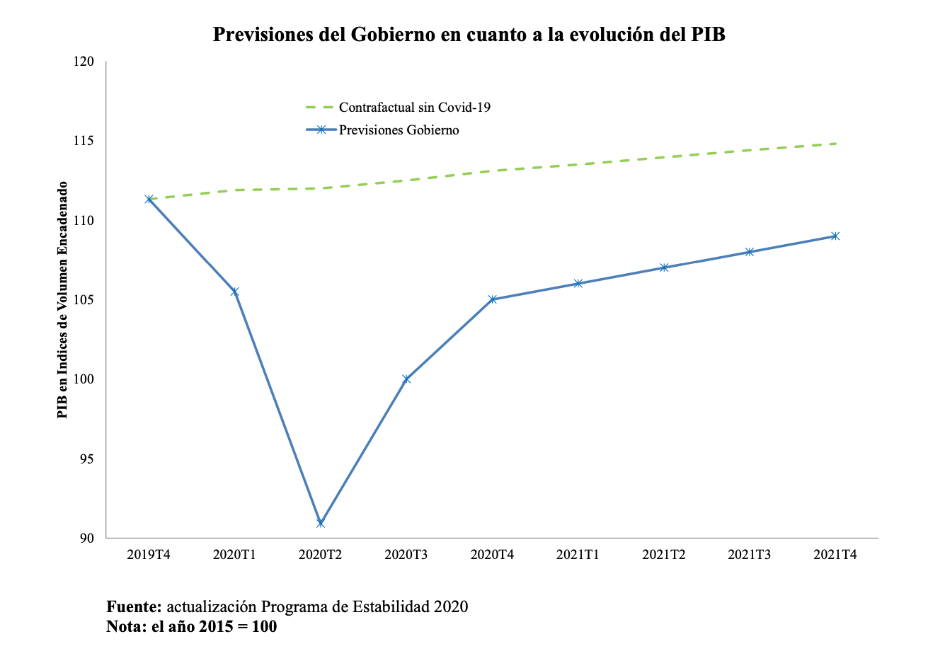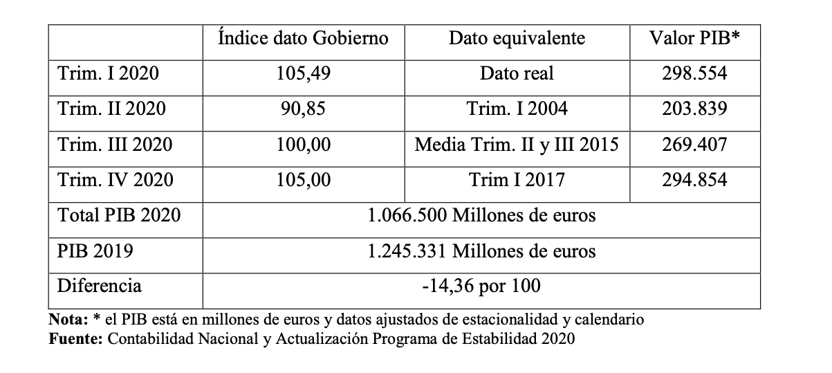 Estas cifras significan que, "de acuerdo, con la propia metodología empleada por el Gobierno y utilizando sus propias proyecciones, la caída del PIB en 2020 sería del 14,36%, frente al 9,2% previsto por el Ejecutivo en el cuadro de Perspectivas macroeconómicas del Plan de Estabilidad".