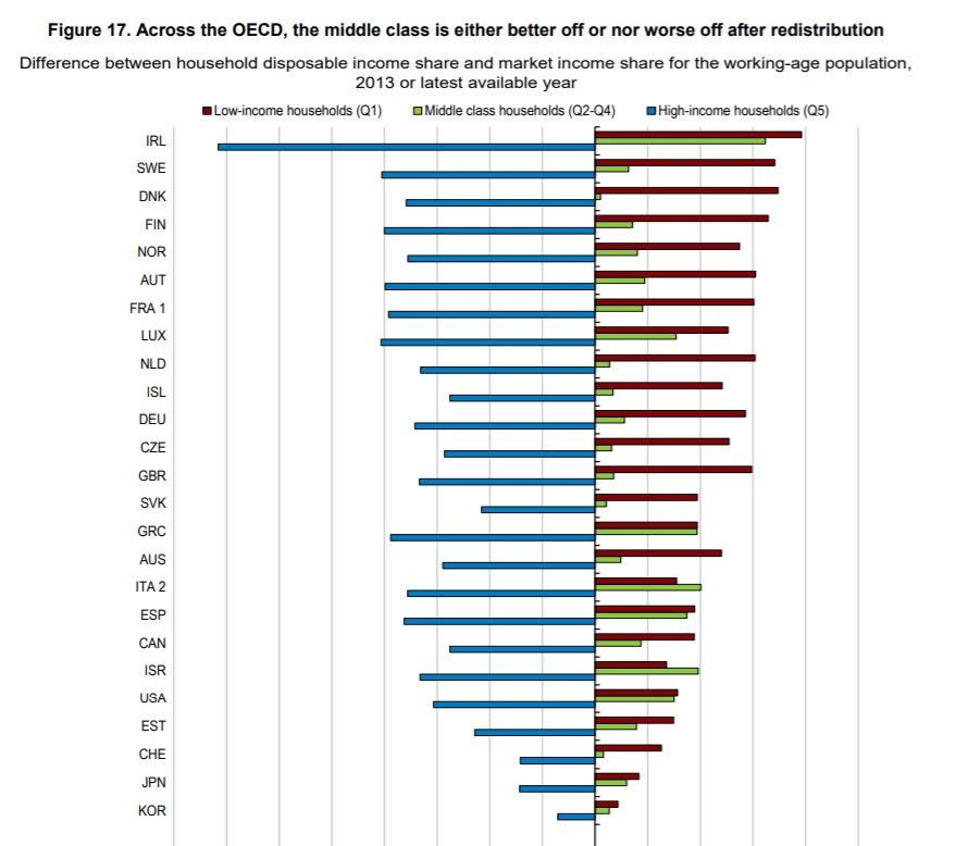 De hecho, en el diseño del IMV se percibe que el objetivo de la medida es que la renta llegue realmente a los hogares a los que va dirigida. Porque aquí hay otra cuestión de esas que los expertos conocen desde hace años, pero no sale demasiado en los medios (de nuevo, la corrección política y no decirle al lector tipo lo que no quiere escuchar): los programas de redistribución en España han fallado hasta ahora no porque los ricos se hayan escapado de los mismos o no hayan pagado lo que el Gobierno de turno ha decidido que les tocaba. En realidad, como puede verse en el gráfico de la derecha (clic para ampliar) en España lo que pierden los hogares de rentas altas por las medidas redistributivas (impuestos y prestaciones) está más o menos al nivel de los países del norte de Europa; la diferencia con estos países se encuentra en los hogares pobres (que en España también ganan con este tipo de políticas, pero menos que en otros lugares) y, sobre todo, en los hogares de clase media (que en España salen más beneficiados que en otros países en este juego de sumas y restas) [El gráfico está tomado del estudio Income Redistribution Through Taxes and Transfers across OECD Countries, vía Ángel Martínez Jorge].