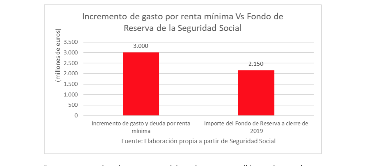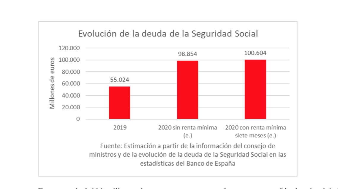 Eso significaría que a los alrededor de 14.000 millones anuales de incremento de deuda de la Seguridad Social de un año a otro -incrementada este año, por las circunstancias excepcionales que vivimos en otros 30.000 millones adicionales-, habría que sumarles otros 3.000 millones más. De esa manera, sólo por la evolución deficitaria del sistema, sin aplicar la renta mínima, la deuda de la Seguridad Social puede acabar en 2020 en casi 100.000 millones de euros-. Si, además, se aplicase la renta mínima, sobrepasaría los 100.000 millones de euros (contando sólo con siete meses de aplicación de dicha renta).