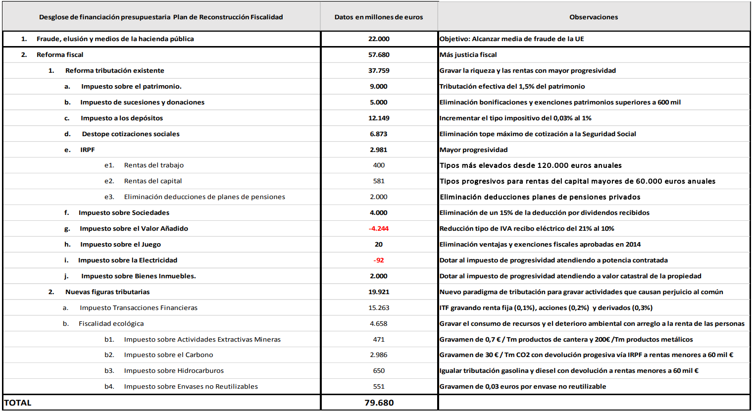 Sustituir el actual Impuesto de Patrimonio, en manos de las CCAA, por un nuevo Impuesto sobre la Riqueza y Grandes Fortunas, de carácter exclusivamente estatal. El tipo medio efectivo pasaría del 0,17% al 1,5% para recaudar unos 9.000 millones al año.