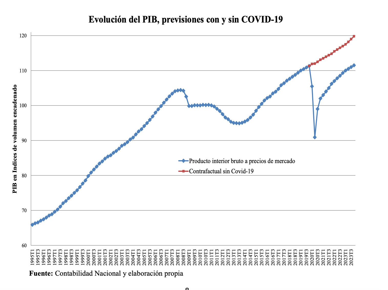 La consultora Freemarket Corporate Intelligence ha hecho una estimación sobre el ciclo de recuperación. El propio gobierno de España debería haber incluido un cálculo de este tipo en su Plan de Estabilidad, pero las previsiones remitidas a la Comisión Europea apenas incluían datos para 2020 y 2021, de modo que no hay un cálculo oficial que determine cuándo se habrá recuperado el PIB.