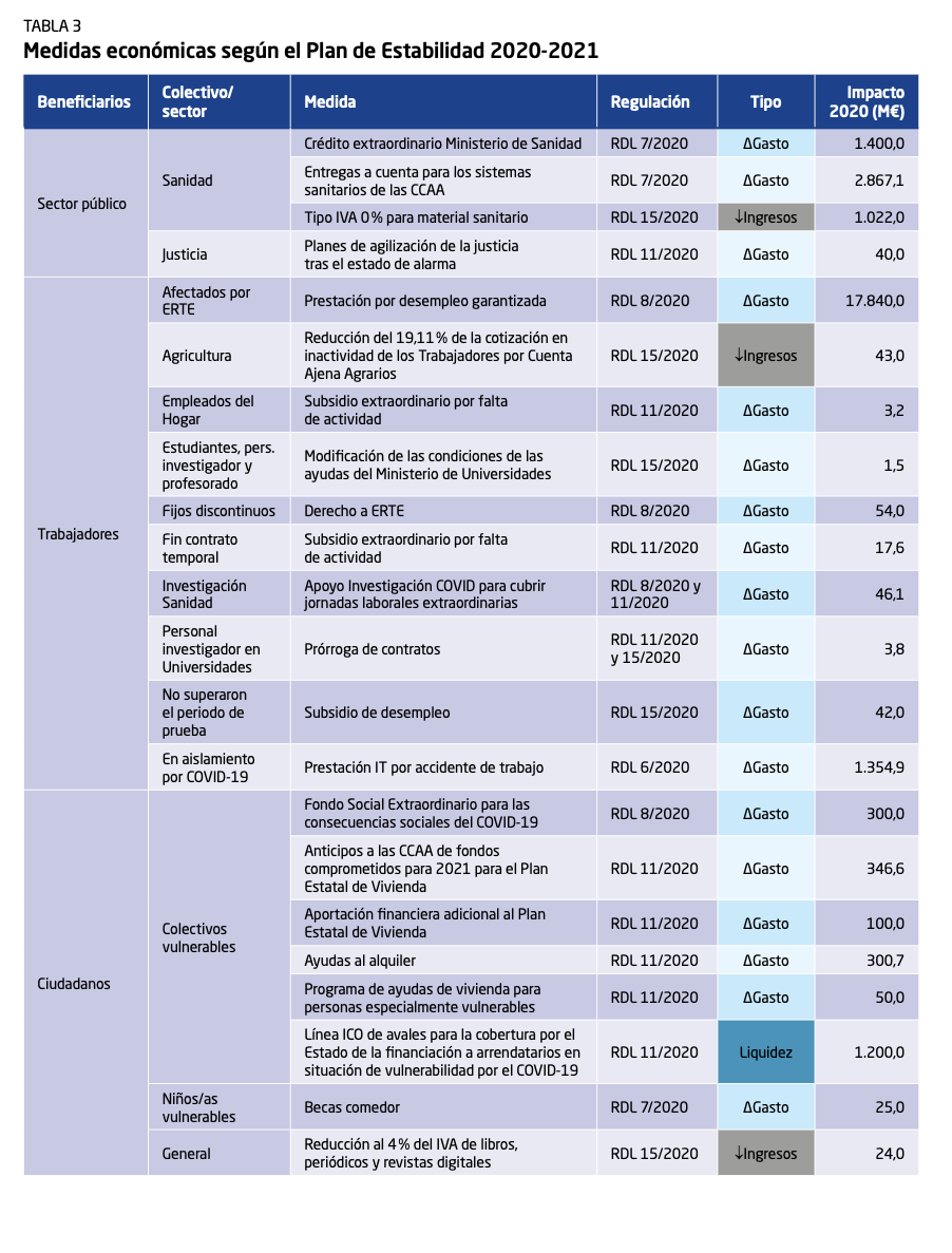 De todas las medidas anunciadas, las que tienen un impacto más positivo son los créditos avalados por el ICO (pueden salvar hasta el 8,6% del Valor Añadido Bruto creado por el PIB, manteniendo así 1,7 millones de empleos). También los ERTE pueden tener un impacto favorable, pero todo dependerá de su extensión: zanjar su validez en verano aumenta el VAB un 1,9% y mejora los datos de paro en 377.000 ocupados, pero extender su aplicación hasta diciembre permite un impacto mayor en el VAB (4,6%) y el mercado laboral (906.000 empleos). Esto implica que medio millón de empleos pillados en ERTE se perderán si los plazos del gobierno no son flexibles. De momento el plazo de expiración de los ERTE está en el 30 de junio, aunque el Gobierno ha abierto la puerta a ampliarlo.