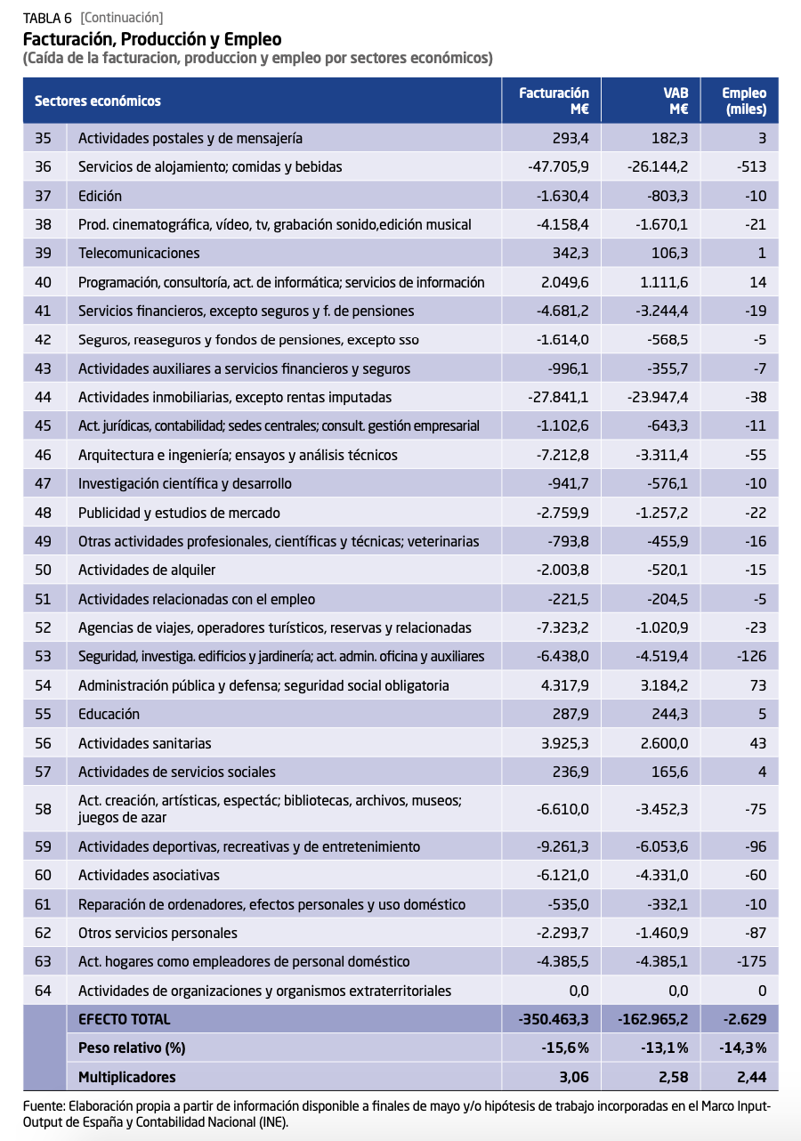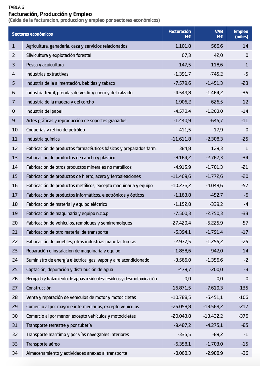 Por ramas de actividad, la siguiente tabla detalla las caídas esperadas en términos de facturación, valor añadido bruto y empleo creado. Los descensos más acusados serán para los servicios de alojamiento, las actividades inmobiliarias y la construcción, la fabricación de vehículos y el comercio mayorista y minorista.