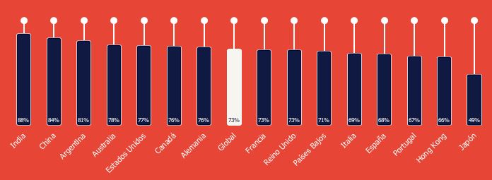 España se encuentra a la cola de Europa en este aspecto, registrando únicamente Portugal un porcentaje más bajo (67%). Esta flexibilidad se permite más en Italia (69%), Países Bajos (71%), Reino Unido, Francia (73%) y Alemania (76%). Los países en los que más se permite modificar los horarios son India (88%), China (84%) y Argentina (81%).