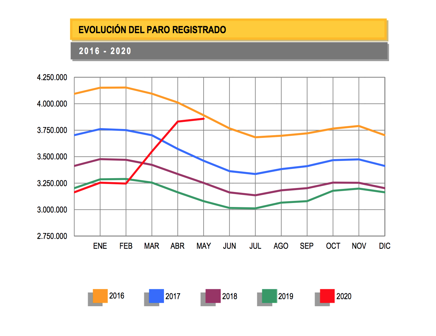 El último dato de paro registrado que ha publicado el Ministerio de Trabajo es el de mayo, cuando nuestro país cerró con 3.857.776 desempleados, en el peor mayo de la historia. Estos números implican 778.285 parados más que hace un año, lo que supone un incremento insólito del 25,27% en la tasa interanual y 26.573 parados más que en abril, cuando la actividad del país estaba en plena parálisis. En los meses de marzo y abril, la pérdida de empleos ha provocado una auténtica sangría debido al cerrojazo de la economía. Y todo ello sin tener en cuenta los ERTE, cuya contabilidad estadística ha salvado al Gobierno de la debacle en las cifras de empleo.