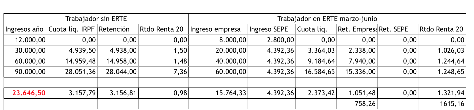 Que con 23.000 euros y un ERTE Hacienda exija más dinero a ese contribuyente que a rentas de más de 30.000 euros, también en ERTE, como aparece en la tabla, no es un error, "se debe a la progresividad del impuesto por la reducción de los rendimientos del trabajo" que no grava con ningún tipo a las rentas de menos de 14.000 euros, pero, a partir de esta cuantía, lo hace en mayor proporción, que es la banda en la que se mueven esos 23.000 euros.