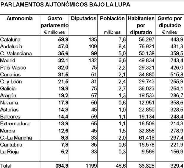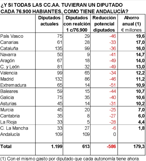 Por ejemplo, si todos los parlamentos autonómicos estuvieran integrados por 1 diputado cada 76.900 habitantes (como Andalucía) y mantuvieran su gasto por diputado actual, el ahorro sería de casi 180 millones de euros anuales.