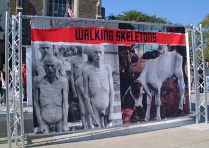 En 2002, durante una exposición y una campaña internacional, la organización PETA presentó las fotografías del "Holocausto en tu plato". En las imágenes se veían animales aglomerados en una explotación ganadera y personas en campos de concentración.