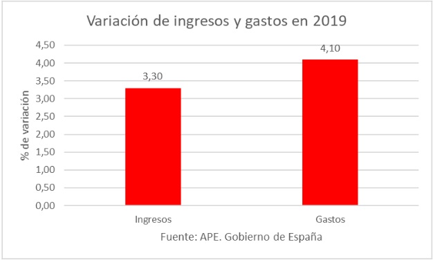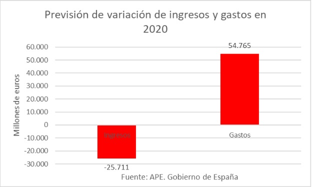 Esa diferencia en la evolución entre ingresos y gastos se agrava en lo previsto por el propio Gobierno para este año, ya que considera que el gasto aumentará en los 54.765 millones de euros ya citados anteriormente mientras los ingresos caerán en 25.711 millones de euros.