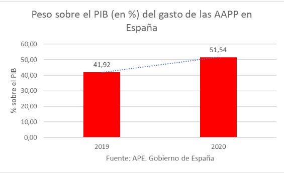 Eso hace que el peso del gasto público supere el 50% del tamaño de la economía nacional, al llegar al 51,54% sobre el PIB en 2020, casi diez puntos más que en 2019, donde representaba -y ya era un peso muy elevado- el 41,92% del PIB.