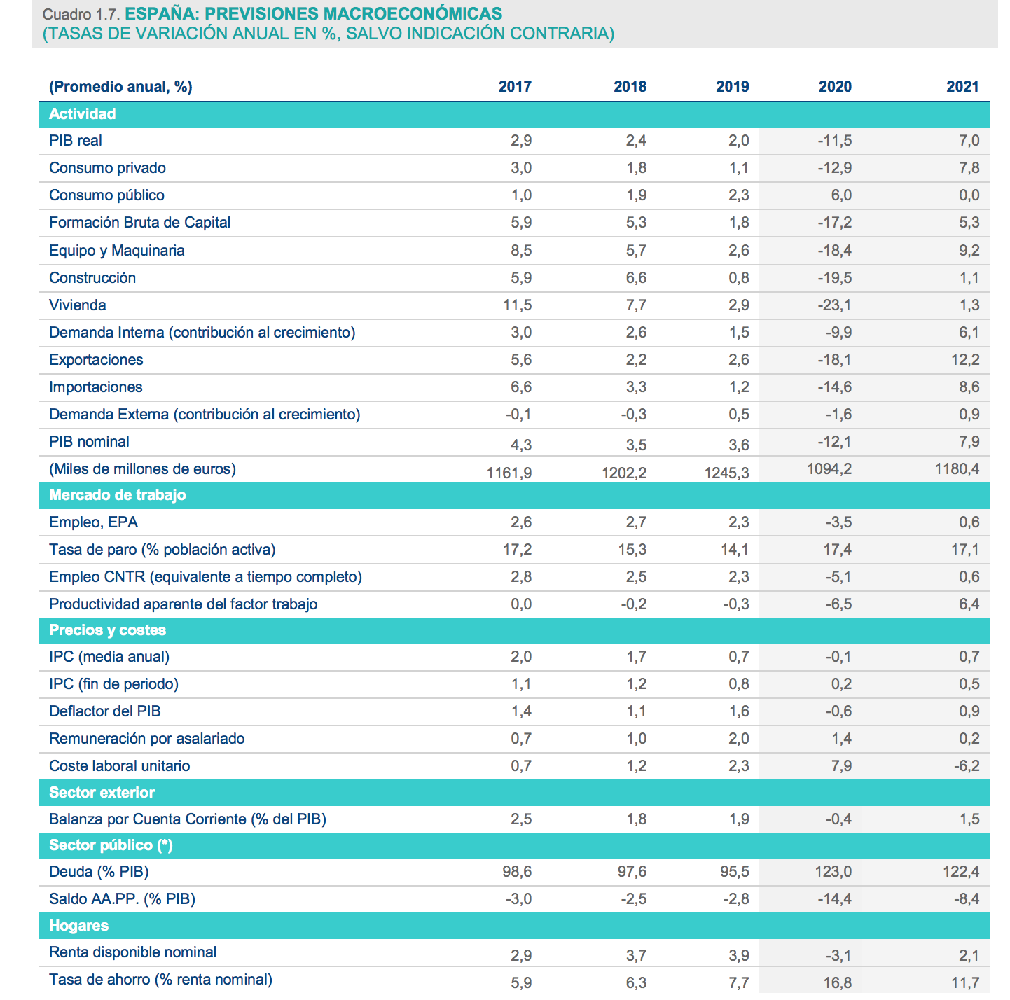 A pesar de este panorama desolador, el Gobierno de Pedro Sánchez mantiene la previsión de caída del PIB en el 9,2%, la única cifra que ha puesto a la recesión y que está muy por debajo de cualquier previsión de los expertos. En cuanto al déficit y la deuda pública, el Gobierno prevé que el déficit alcance el 10,34% del PIB este año y la deuda, el 115,5%. De nuevo unas previsiones demasiado optimistas.