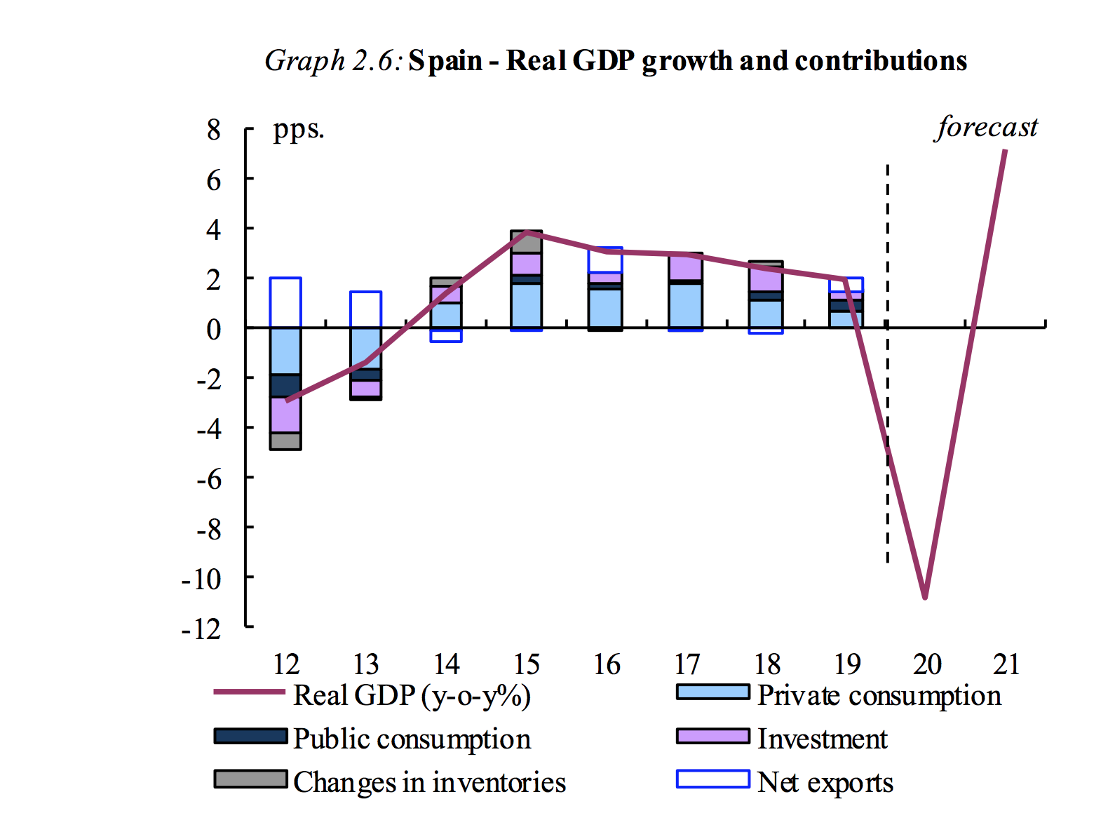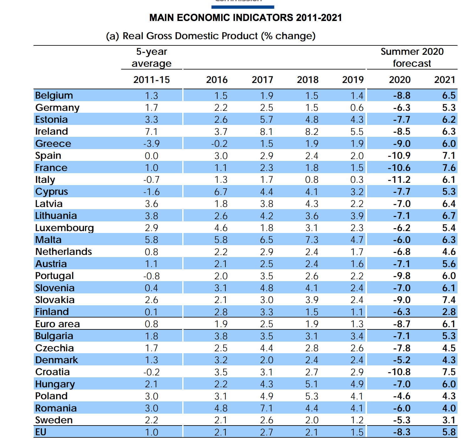 La semana pasada, Bruselas le daba otro mazazo a Sánchez empeorando sus previsiones sobre España. La Comisión Europea, encargada de evaluar las ayudas a nuestro país, prevé ahora una contracción del PIB del 10,9% este año, frente a la caída 9,4% que estimó hace unos meses, para rebotar un 7,1% en 2021. Solo Italia sufriría una caída del PIB superior a la nuestra este año, que sería del 11,2% (el FMI cree que estaremos a la par). Como se observa en la tabla, Francia será el tercer país más afectado con una caída de su economía del 10,6%. Fuera de la zona euro, solo el desplome de Croacia adelanta a Francia.