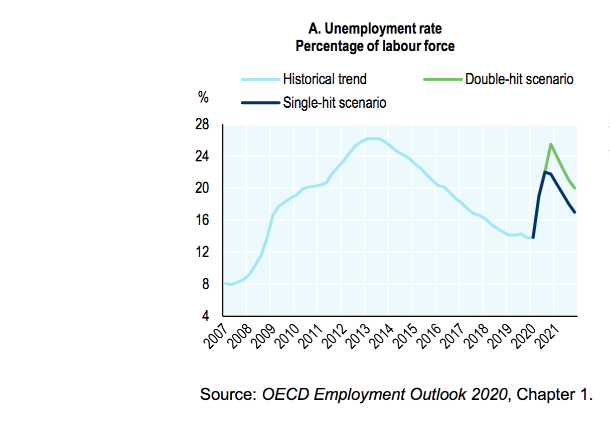 También la semana pasada, la OCDE protagonizaba el varapalo laboral al Gobierno. En su informe anual de perspectivas del empleo, la Organización para la Cooperación y el Desarrollo Económico advertía de que la tasa de paro de España podría superar el 20% este año y llegar al 25,5% si se produce un rebrote del coronavirus en otoño.