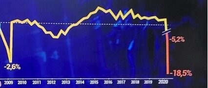 En el primero de ellos, recurrió a un gráfico quebrado, de manera que la proporción del eje cambiaba a partir del momento en el que se quebraba, que es el instante en el que aparecía el dato de PIB del segundo trimestre de 2020. Con ello, la caída de un 18,5% intertrimestral de este trimestre quedaba a la altura de la caída trimestral del 2,6% del ITR- 2009, tal y como se puede comprobar en la siguiente imagen.