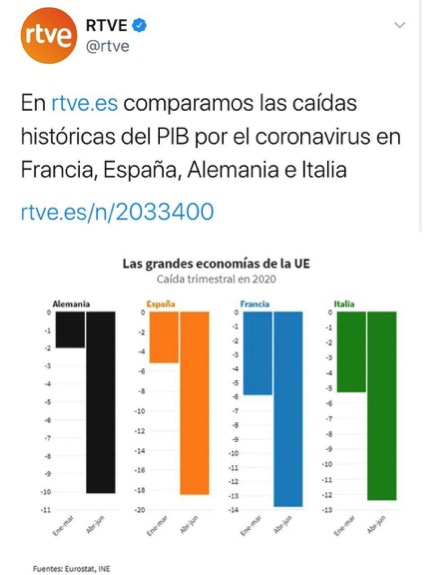 Adicionalmente, RTVE insistía en el juego de los ejes de los gráficos. Ahora, en las redes sociales publicaba un gráfico en el que comparaba la caída del PIB en las cuatro grandes economías de la zona euro: Alemania, Francia, Italia y España. ¿Qué es lo que hizo RTVE? Representar los gráficos de los cuatro países, pero cada uno con una escala en sus ejes, de manera que la escala empleada para Alemania, Francia e Italia era la misma, con la amplitud de una unidad en cada hito en los ejes, mientras que en el caso español esa amplitud era de dos unidades. Con ello, se mostraba visualmente una caída del PIB español aparentemente menor en un simple vistazo rápido, con la apariencia de que era la segunda menor caída, tras Alemania, cuando el PIB español era el que más caía, como se puede mostrar en el siguiente gráfico.