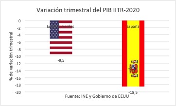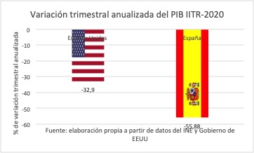 Por último, el ministro Garzón comparaba la caída del PIB de Estados Unidos con el de España, para decir que la evolución era mejor, porque el PIB estadounidense descendía un 32,9% y el español sólo un 18,5%. Olvidaba el ministro de Consumo que el dato de Estados Unidos era el trimestral anualizado, es decir, cuánto caería la economía si durante cuatro trimestres se comportase trimestralmente como el trimestre actual. Como la economía de Estados Unidos había caído un 9,5% intertrimestral (es decir, casi la mitad que España, que cayó un 18,5% trimestral), su crecimiento trimestral anualizado es de una caída del 32,9%. Dicha cifra se obtiene anualizando ese crecimiento: [(1+g)4-1]x100, donde g es el crecimiento trimestral, en este caso, -0,095. Si aplicamos esa metodología con el caso español, comprobamos cómo el crecimiento trimestral anualizado de la economía española es de una caída del 55,88%.