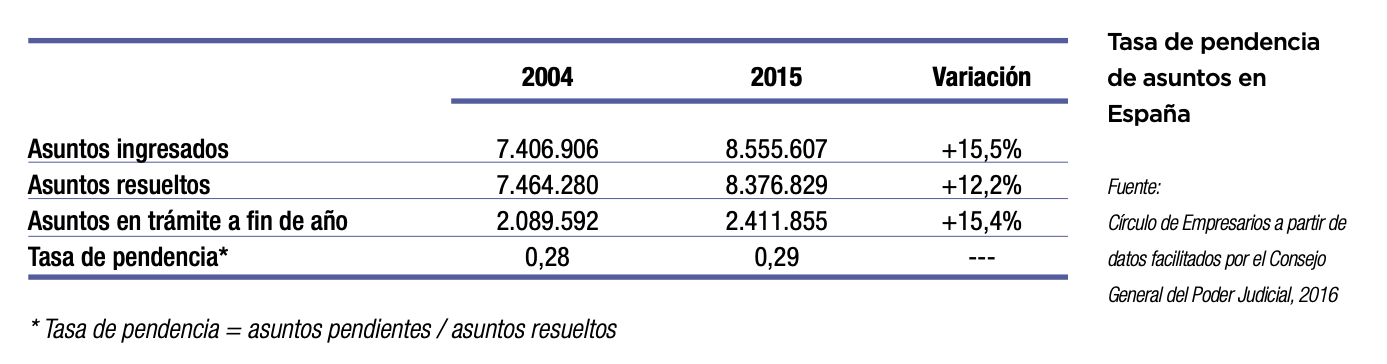 El Círculo de Empresarios ha puesto cifras a la problemática con un interesante informe en el que mide la calidad de nuestro sistema judicial a partir de distintos indicadores. Uno de los más relevantes es la llamada "tasa de pendencia", es decir, el ratio entre los asuntos que ingresan en los tribunales y los procesos que resuelven los mismos. Si calculamos dicho indicador para 2004 vemos que alcanzaba un ratio de 0,28. Durante dicho ejercicio, los tribunales ingresaron 7,4 millones de asuntos y resolvieron 7,5 millones de casos, quedando 2,1 millones en trámite a 31 de diciembre. Por comparación, la "tasa de pendencia" en 2015 era de 0,29, con la entrada de 8,6 millones de asuntos, la resolución de 8,4 millones de casos y un total de 2,4 millones de asuntos en trámite al cierre de ejercicio.